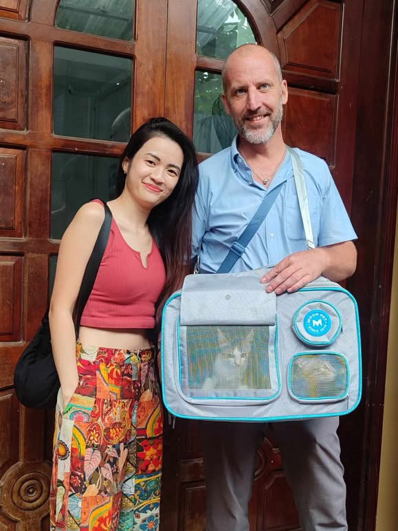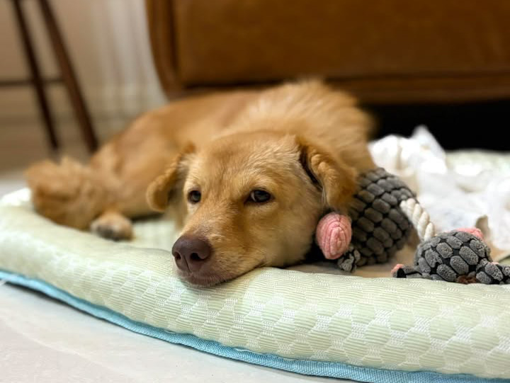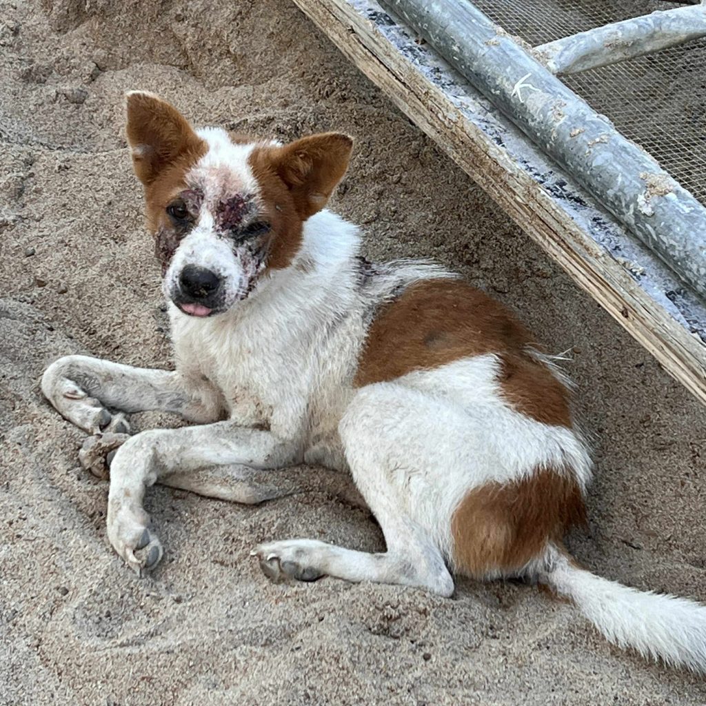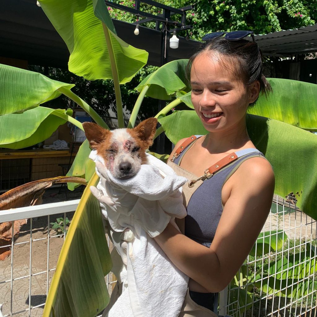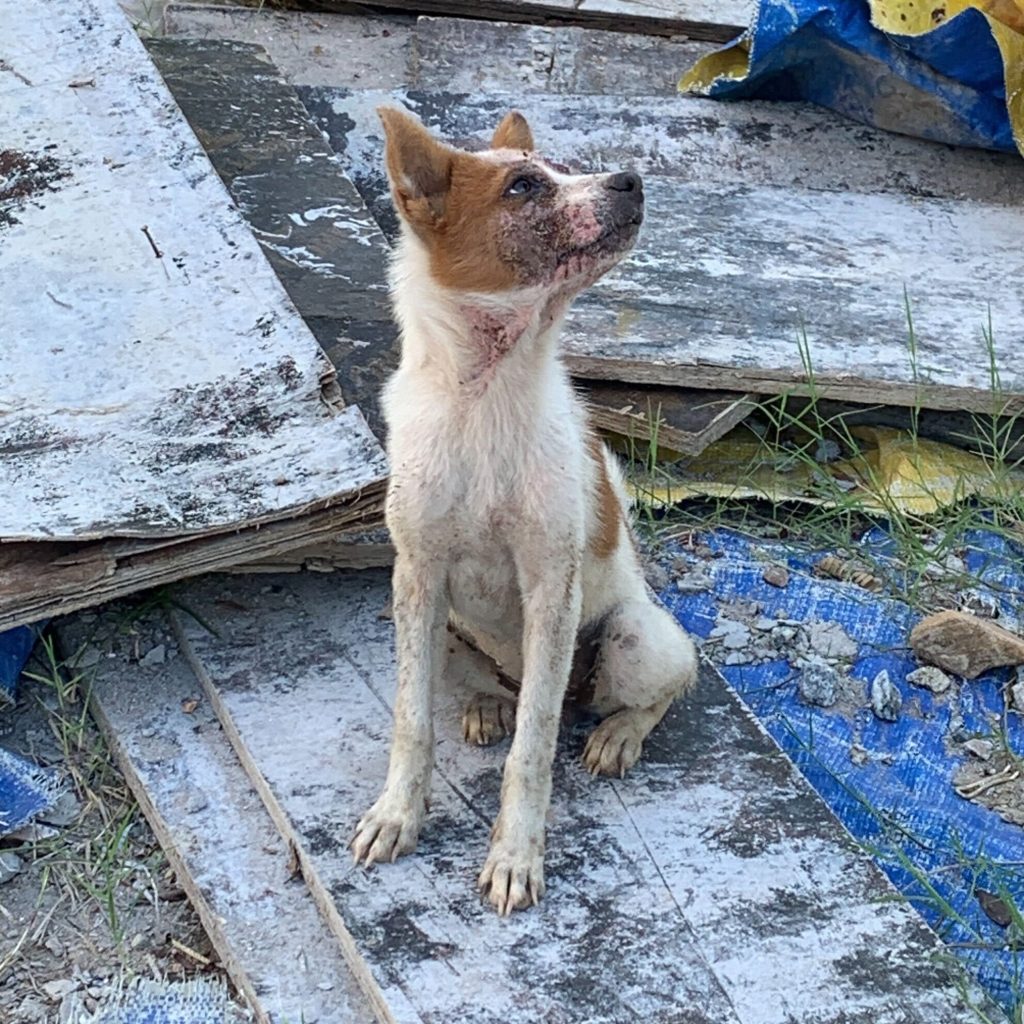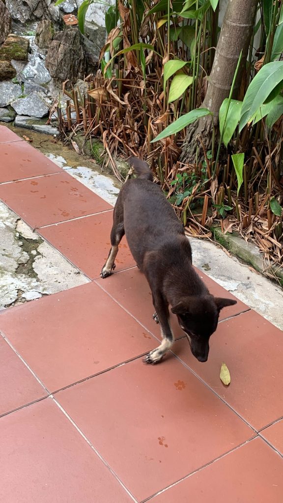 Sweet Lucky was first spotted by a concerned tourist at a local temple, limping painfully and struggling to walk. Her front leg had suffered a severe break that healed badly, leaving her paw twisted at a 90° angle. Every step caused her pain.