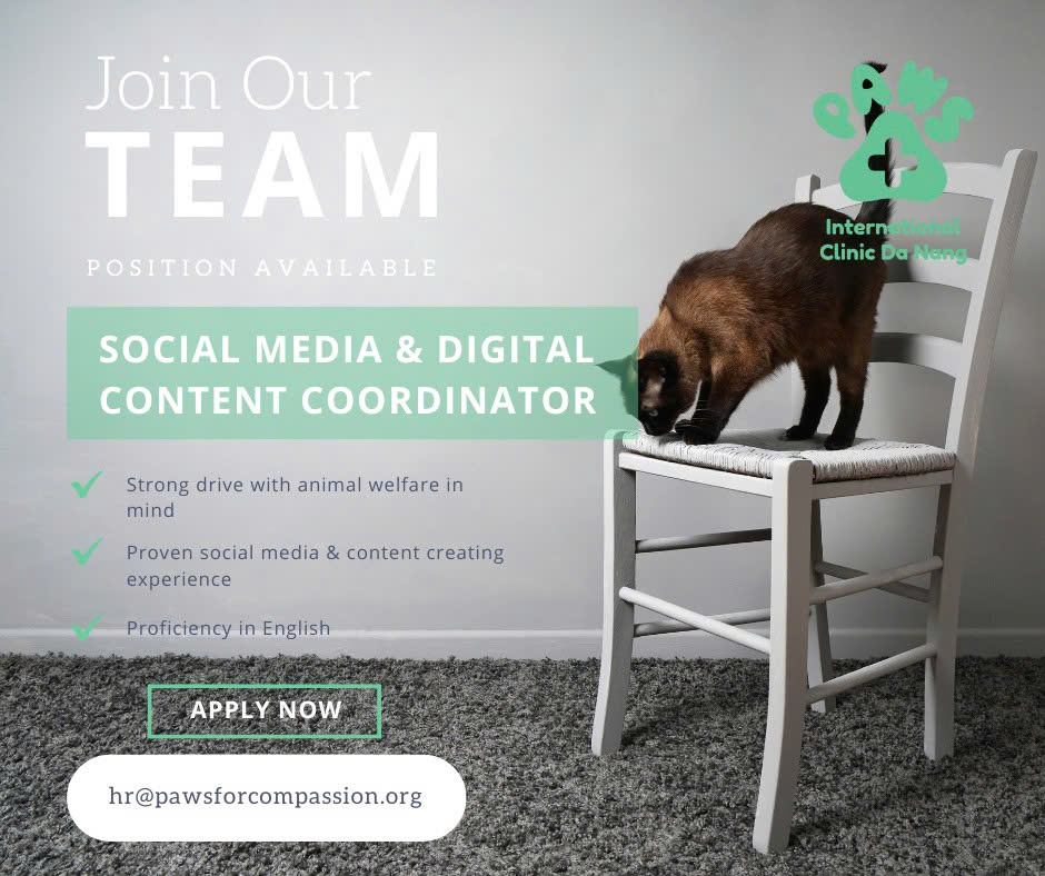 Send your CV to hr@pawsforcompassion.org with a cover letter and the subject line ‘Social media and digital content coordinator’, or complete the online application form below.